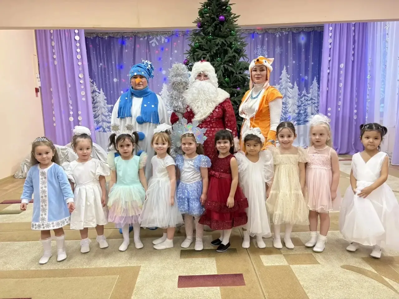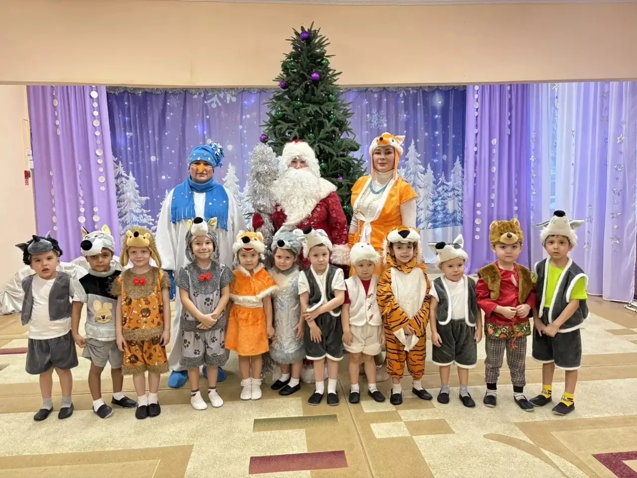 Красиво украшенный зал, нарядная ёлочка подарки, Дед Мороз, хитрая лиса, весёлый снеговик ожидали детей.