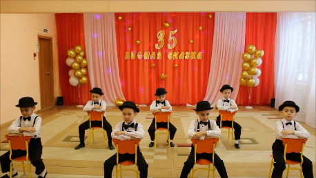 В процессе занятий разучены танцы и танцевальные композиции, которые исполнялись на всех праздниках и развлечениях, проводимых в детском саду. Не исключением стал и наш юбилей. Всем очень понравилось выступление юных артистов.